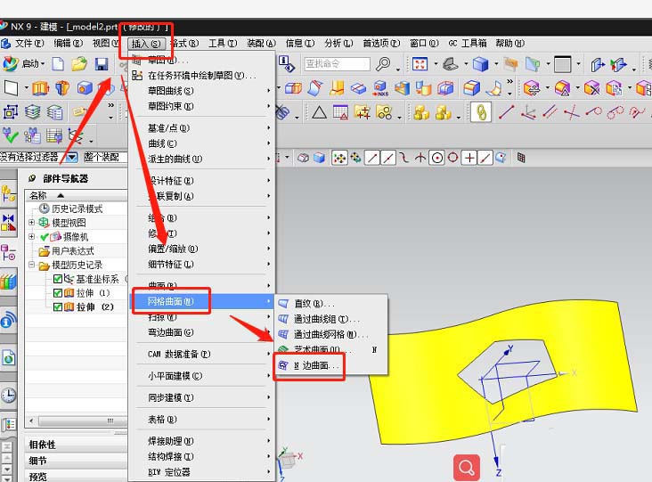 2、依次选择菜单栏上的插入-网格曲线-N边曲面
