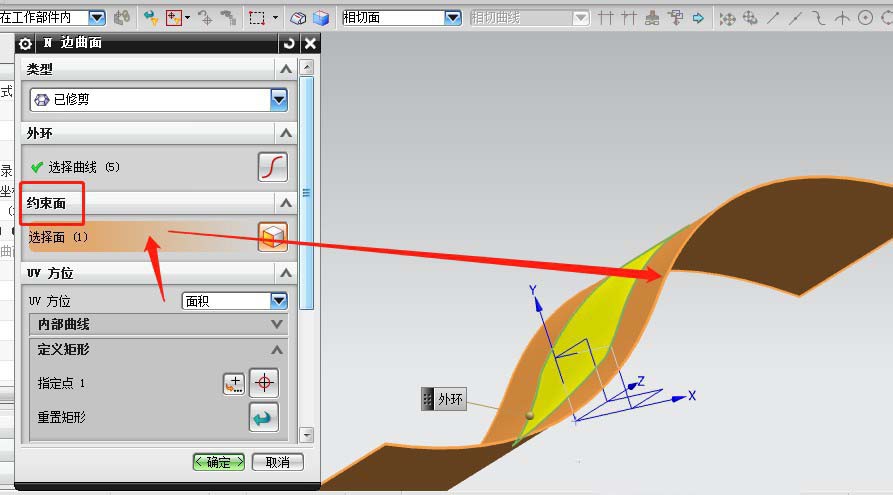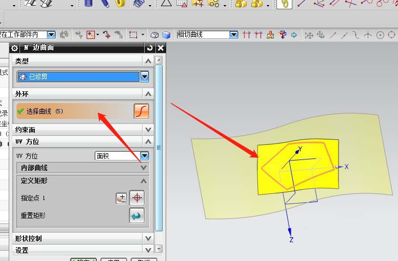3、进入N边曲面命令后,选择片体孔的边,这时候补出来的面比我们需要的要大