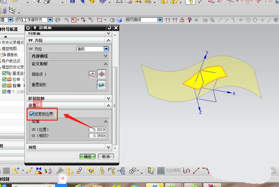 4、点击N边曲面的菜单栏中的设置,勾选上下方的修剪到边,这时候大小就是所缺的部分