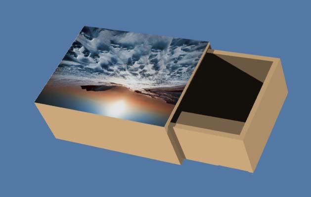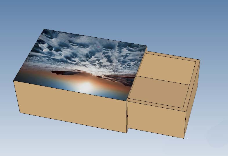 10、如下所示,选中壳子的外平面,智能渲染,添加贴图,上下两面都贴。至此,火柴盒设计完成。