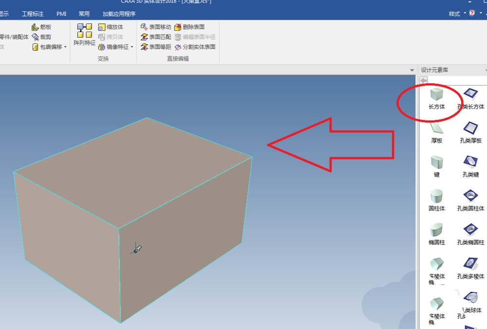 2、如下所示,从设计元素库中拖一个长方体到三维空间释放,快速创建长方体。