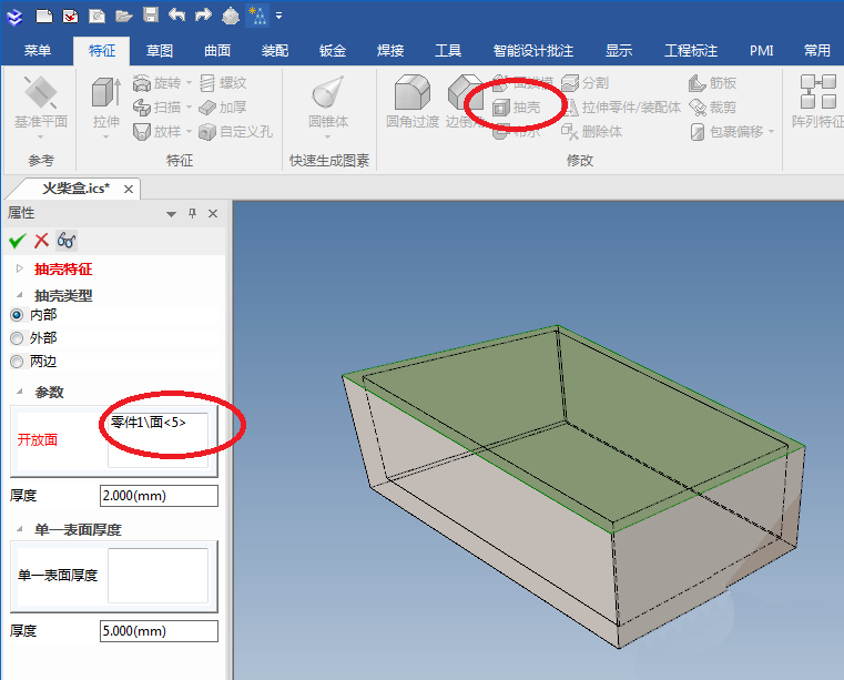 4、如下所示,点击特征工具栏中的“抽壳”命令,然后属性栏中的开方面:选择上表面,厚度为2,看着预览效果点击√,完成并应用。