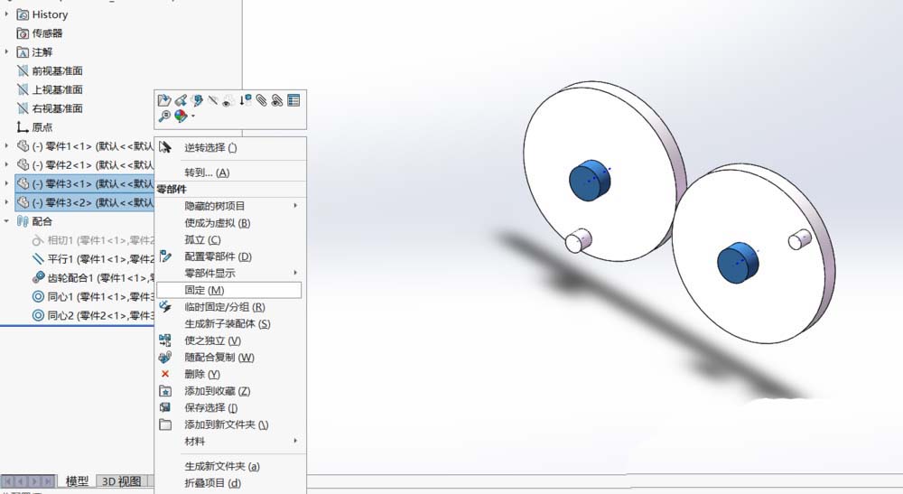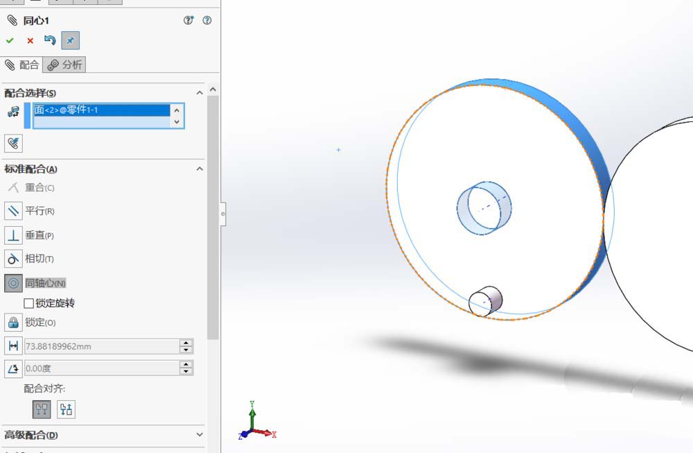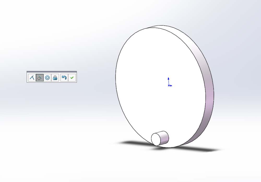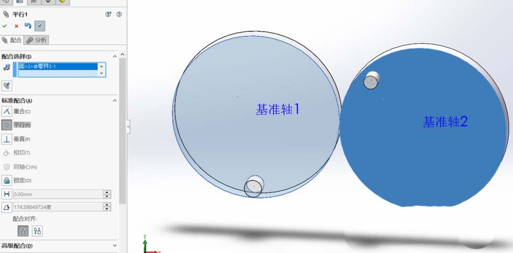 5、添加两个小圆柱并分别做同轴心配合,作为旋转中心,使小圆柱处于固定状态,使第一个大圆柱处于浮动状态。