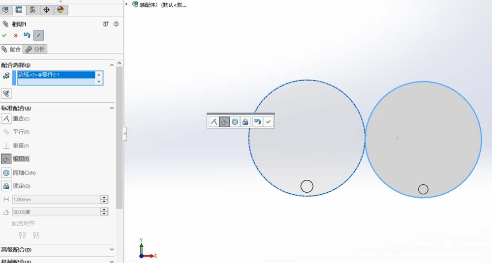 2、装配体,插入之前画的圆柱,复制一个圆柱,添加外边线相切配合。