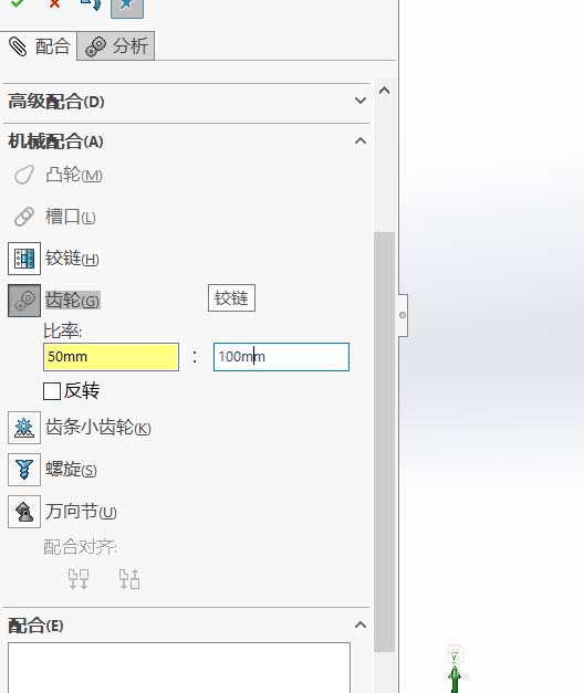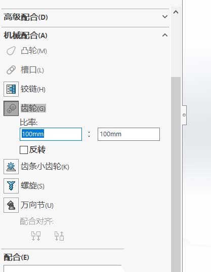 4、压缩相切配合,添加齿轮配合,选择两条外径线,按实际齿数更改比率。
