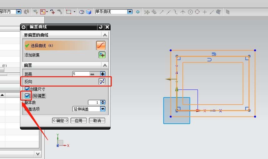 6、如果方向有问题,点击反向,想要两边都偏置,勾选对称偏置,然后点击确定即可