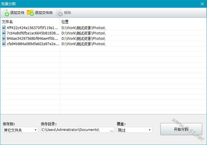 在这个批量分割窗口里,可以添加多个图片文件,设置好保存位置等相关选项后,点击右下角“开始分割”按钮,即可以一键将所有的图片分割为多个图像块了。