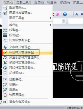 1、在绘图窗口显示的CAD图纸中,移动光标选中需要添加上前后缀的“标注文本”,然后点击菜单栏中的【格式】-【标注样式管理器】选项。