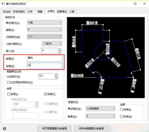 3、这时候会弹出【替代当前标注样式:XXXXX】次弹出,在其中切换菜单栏到【主单位】页面。我们找到【前缀:】和【后缀:】输入框,进行如下操作: