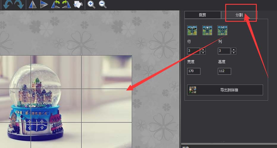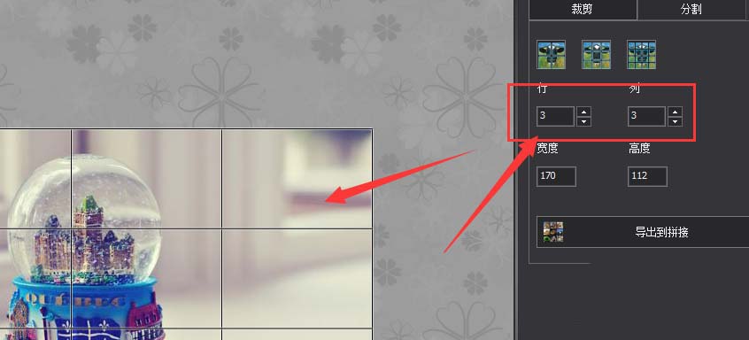 4、在下面可以调整分割的行、列数值,调整好数值后,在左侧图片上会直接出现裁切线
