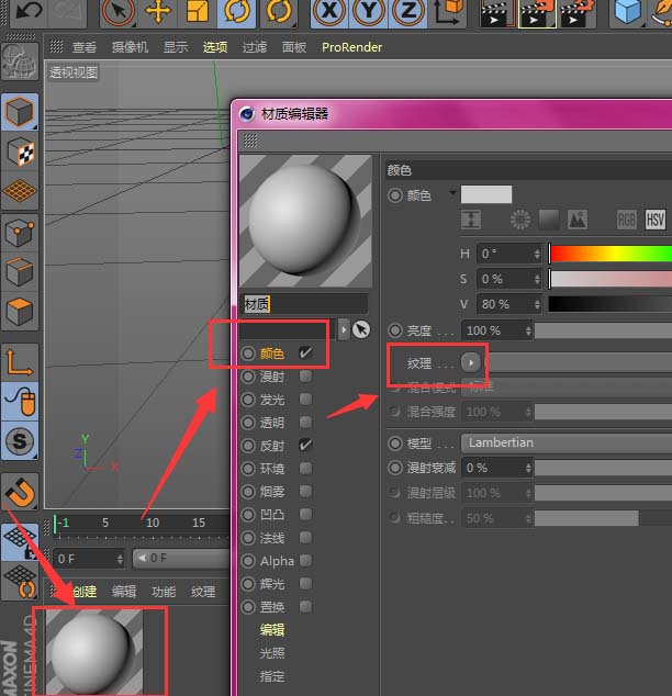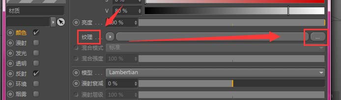 3、打开材质球属性,在颜色属性中,找到纹理