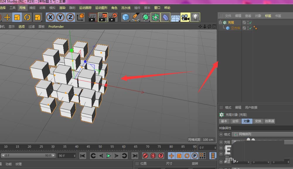 2、在克隆属性中,添加网格排列属性设置,如图;然后再在底部建立一个平面