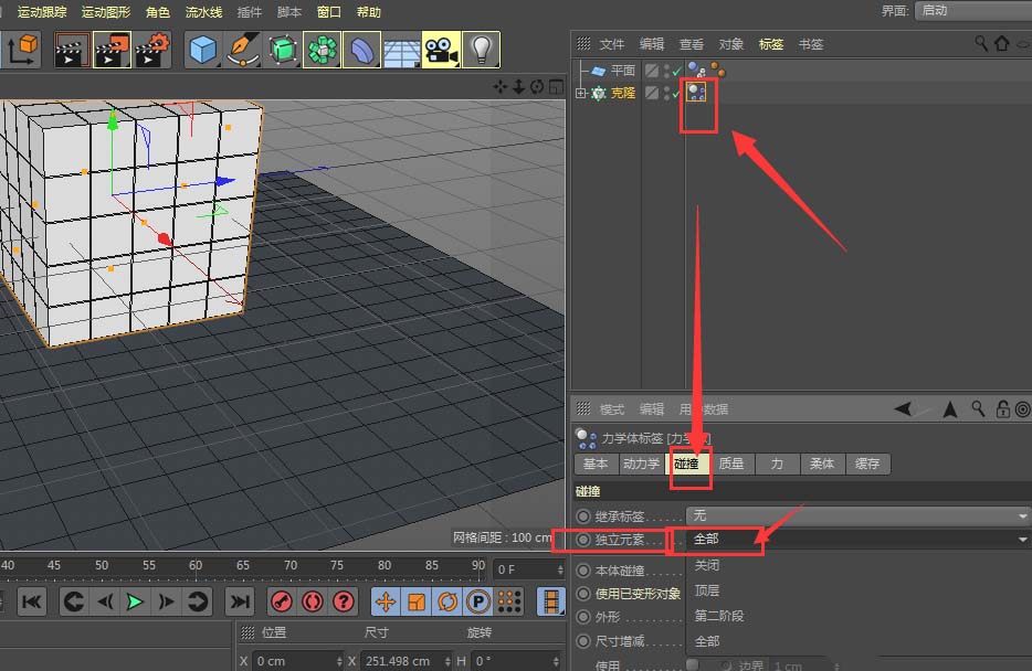 5、选中添加到克隆属性中的钢体属性设置,在下面的碰撞属性中选择独立元素为全部,如图
