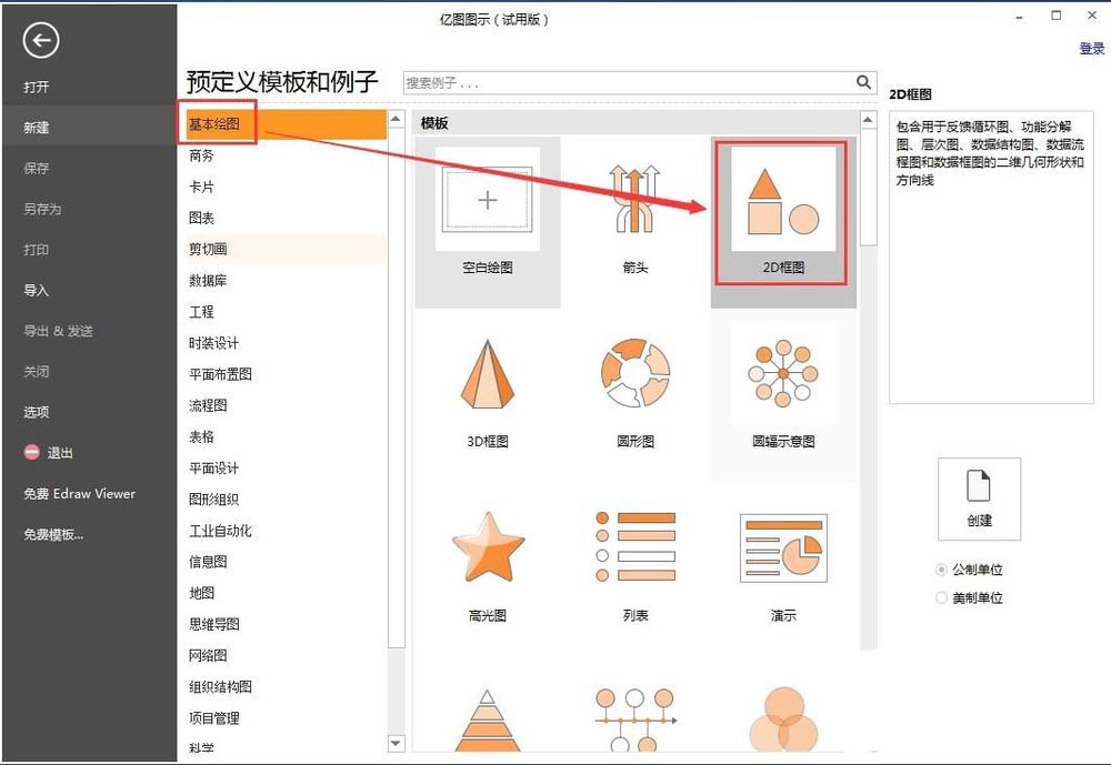 2、在预定义模板和例子中点击基本绘图,选择2D框图;