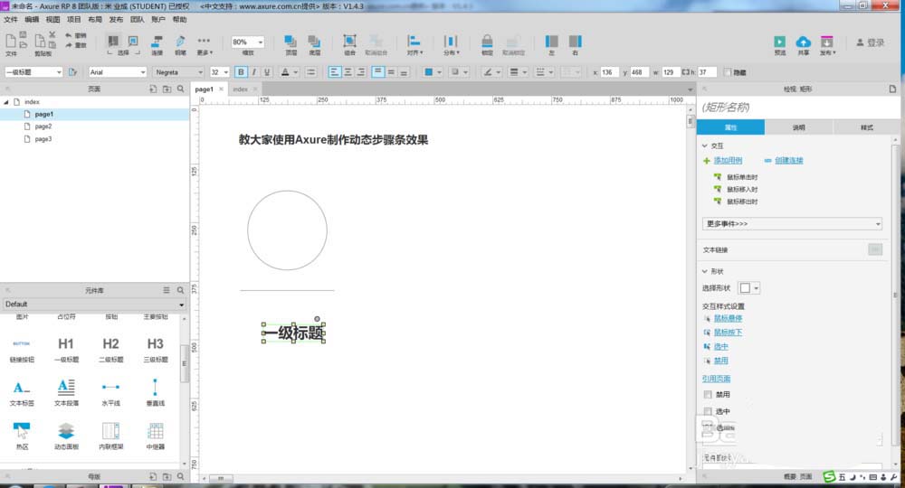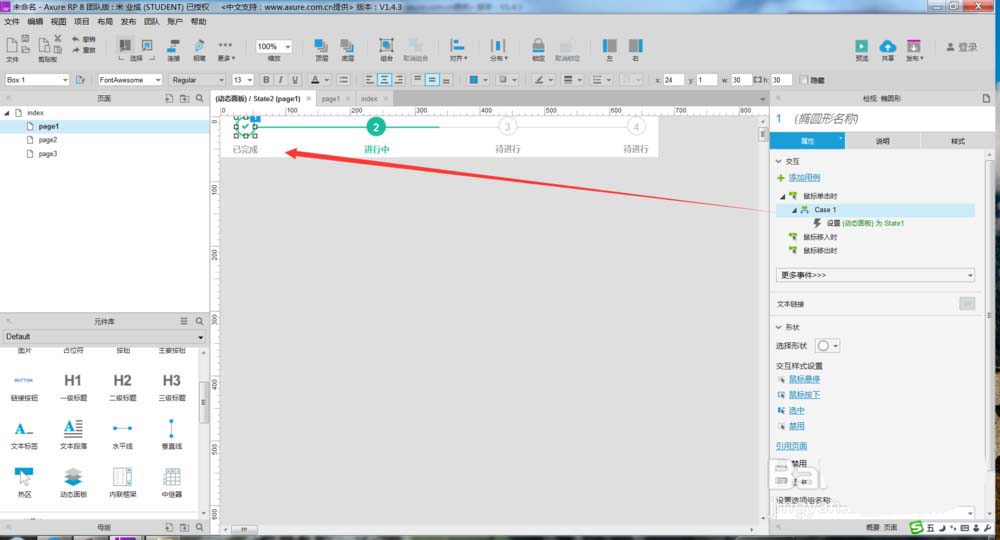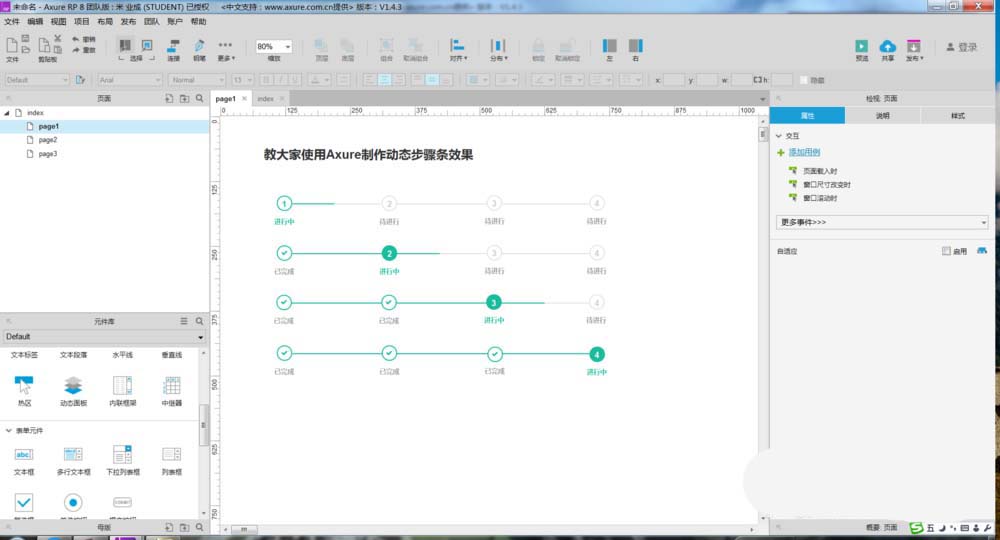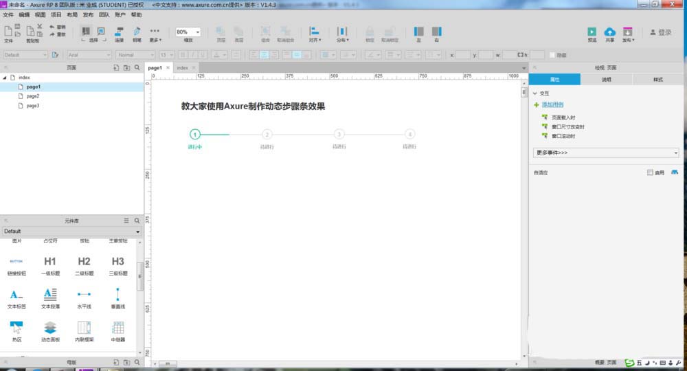 1、打开Axure,今天教大家使用Axure制作动态步骤条效果,如下图所示。