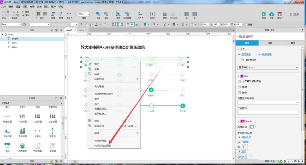 5、制作完成后,我们右击其中一个步骤条,将其转换为动态面板,如下图所示。