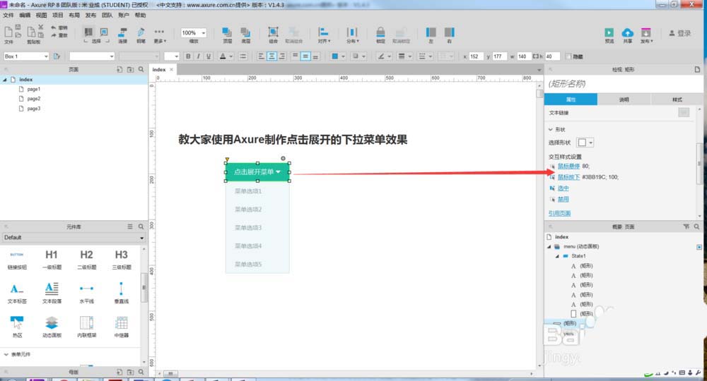 5、双击进行到动态面板,给各个菜单加一些鼠标悬停的颜色,如下图所示。