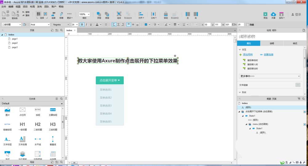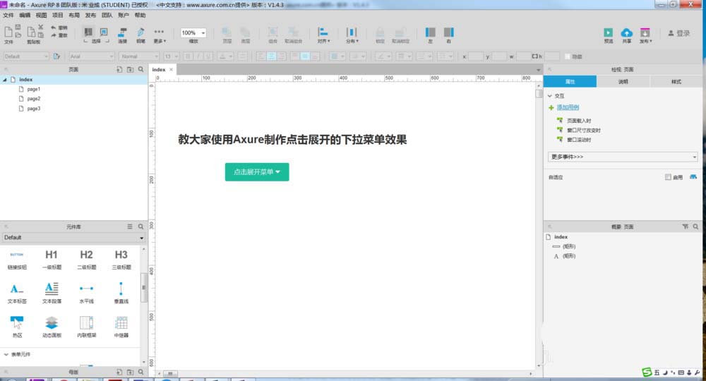 1、打开Axure原型工具,今天教大家使用Axure制作点击展开的下拉菜单效果,如下图所示。