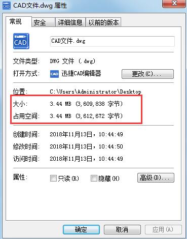 在计算机桌面鼠标右击“属性”选项,打开需要清理的CAD图纸文件,我们查看一下未清理前的文件大小!这里以命名为“CAD文件”图纸为例。可见文件大小为3.44M B,如图所示: