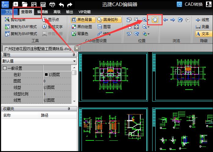 电脑桌面找到迅捷CAD编辑器标准版软件,并双击启动运行软件,进入软件可操作界面。在默认“查看器”窗口选择“位置”—“平移”工具,可随意平移浏览图纸。