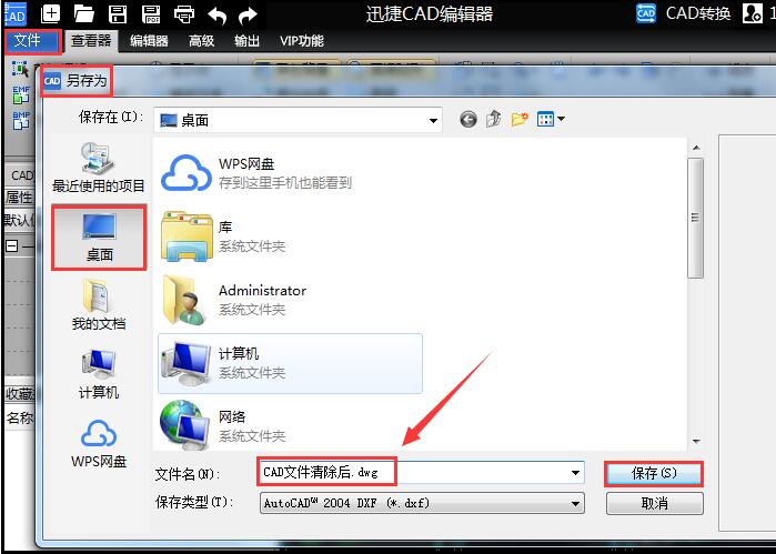 关闭清理界面弹窗,点 击“文件”—“另存为”按钮,将清理后的CAD图纸文件保存至电脑桌面即 可。