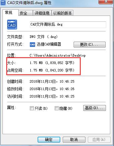 在计算机桌面找到清理后的CAD文件,同理,鼠标右击,打开文件属性面板,此时查看清理后的CAD图纸文件大小只有为1.75M B。如图所示: