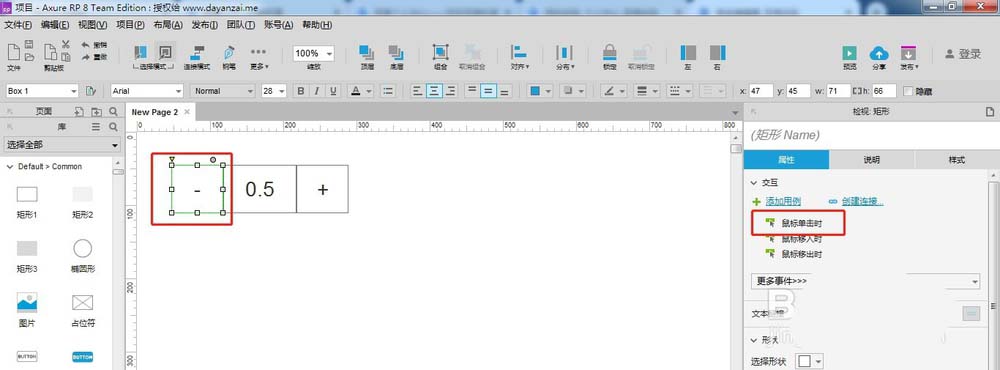 4、选中左边矩形框,在右边栏中属性下单击鼠标单击事件
