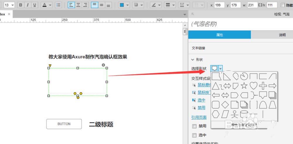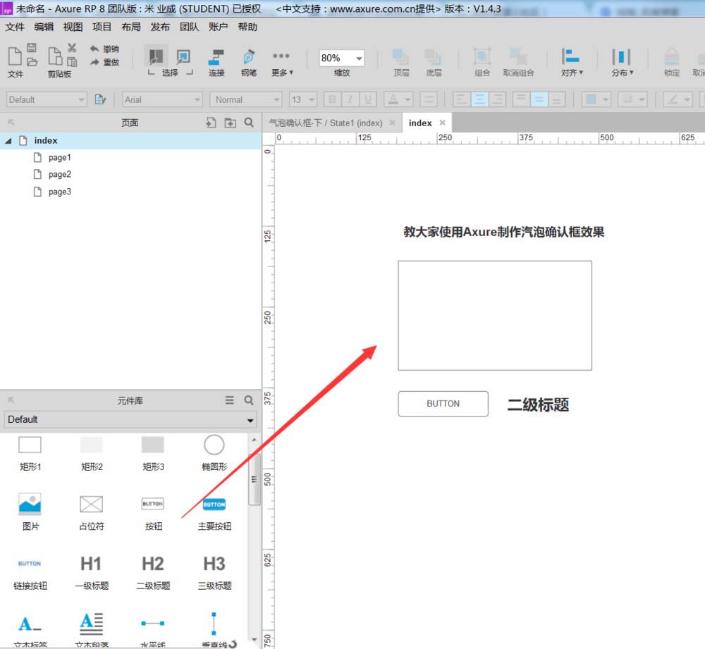 1、打开Axure,今天教大家使用Axure制作汽泡确认框效果,如下图所示。