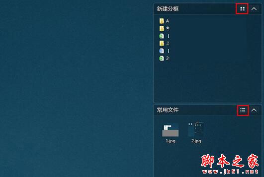 3、当分框都新建、放置好了之后,当然是要开始调节每个分框的样式啦,毕竟每个文件筐放置的文件不同,放置的数量也是不一样的,当数量多到大于分框所提供的面积时,只需要点击分框右上角的“模式”进行切换,像图中小编的两个分框,上面的文件筐为列表模式,下面的文件筐为图标模式,根据自己的需要进行调整;当你暂时不需要用到某个分框内的文件时,就可以点击分框右上角的“收起分类框”选项进行缩小隐藏,如下图所示: