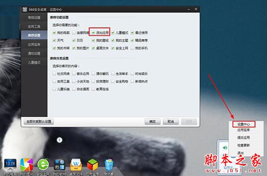 4、如果你的“添加应用”功能没有出现在桌面上,请不要着急,说不定只是360安全桌面的设置问题哦,用户只用在设置中心的“推荐设置”中找到“添加应用”,将其进行勾选即可正常添加应用,如下图所示: