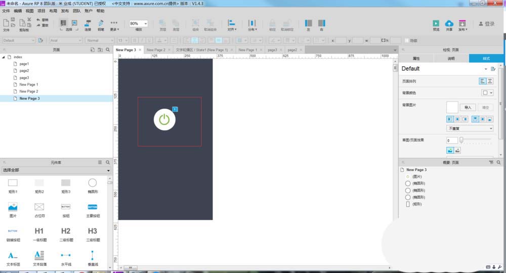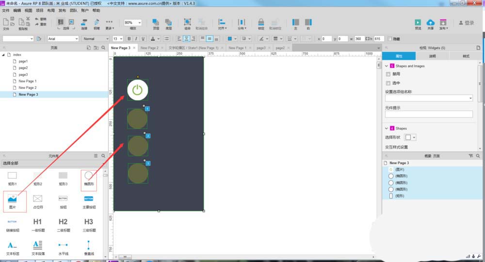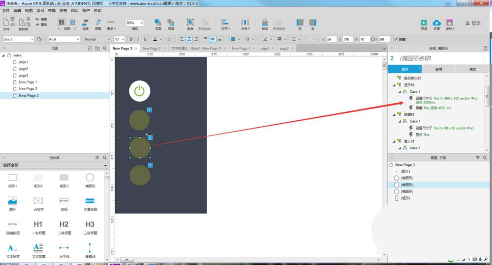 5、所有交互事件设置完成后,我们需要把元件放到一个位置,如下图所示。