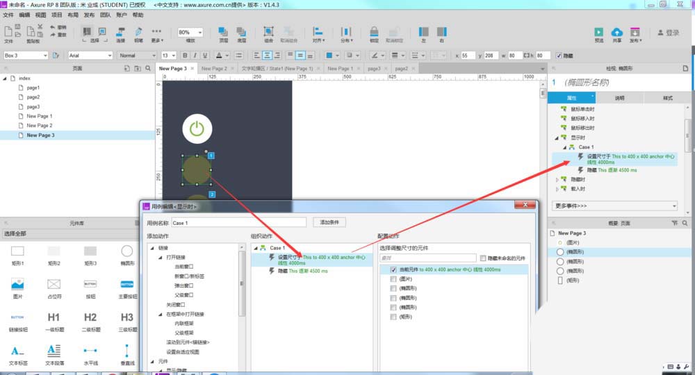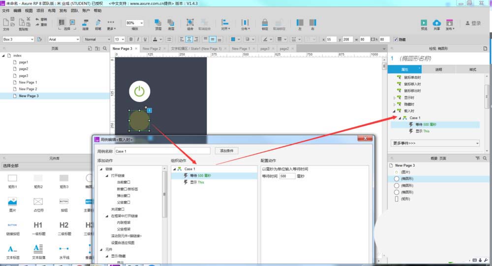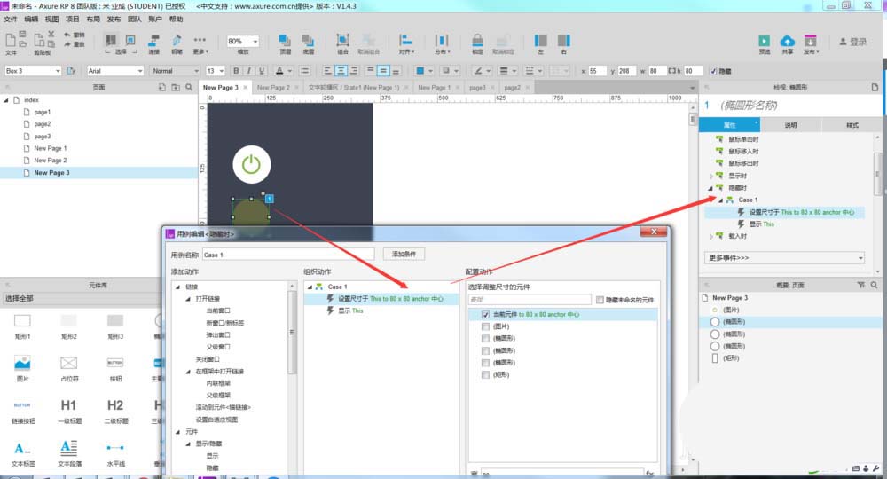 3、然后给其中一个元件做交互事件,如下图所示。
