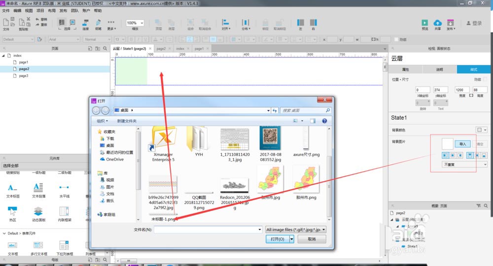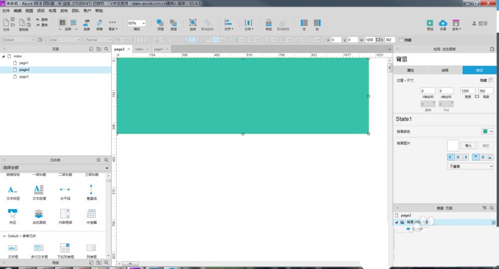 2、然后我们打开Axurea工具,新建一个页面,将一个矩形拖入到工作区域,如下图所示。