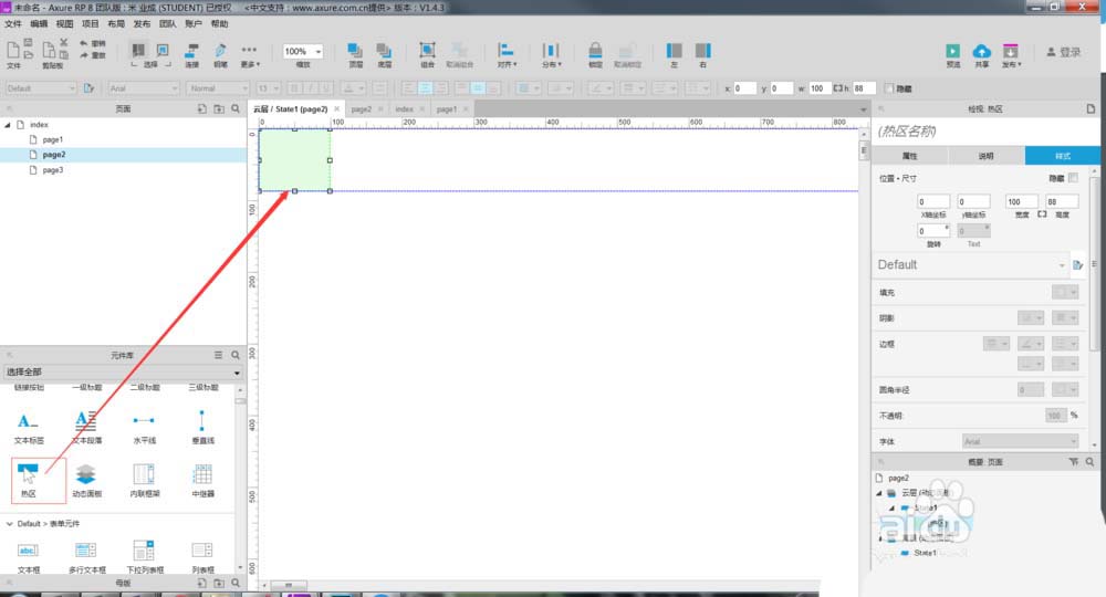 5、进入到动态面板中,拖入一个热区,如下图所示。