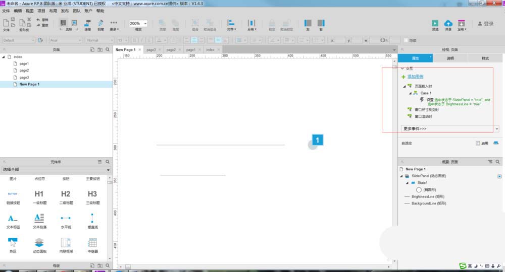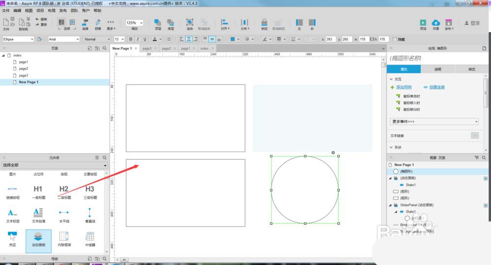 1、首先打开Axure,新建一个空白页面,在页面中拖入本次使用的元件,如下图所示。
