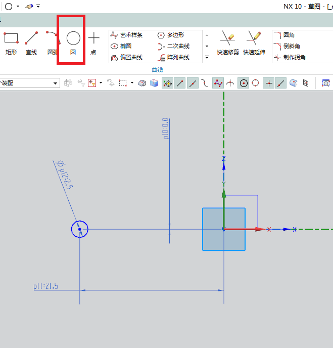 4、如下图所示,成功进入草图,激活圆命令,然后在纵轴的左边随手画一个圆,然后双击修改圆的尺寸,圆的直径为ø2.5,圆心距离横轴的距离为0,距离纵轴的尺寸为21.5,然后点击工具栏中 的 完成 图标。