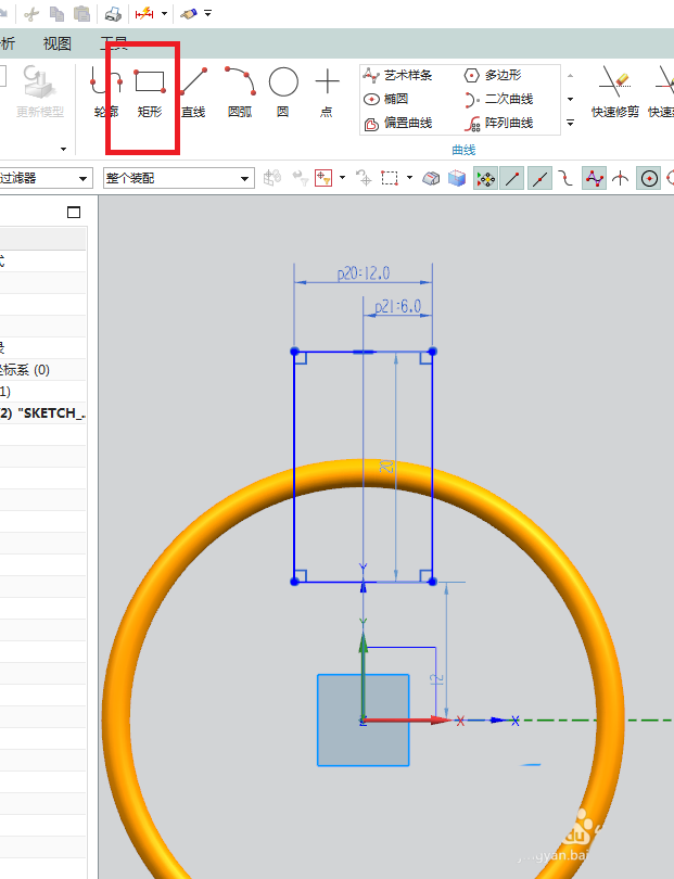 7、如下图所示,点击工具栏中 的 矩形图标,激活矩形命令,然后随手画一个矩形,然后双击修改尺寸的标注,矩形的宽为12.0,矩形的右边线距离纵轴6.0,点击 完成。
