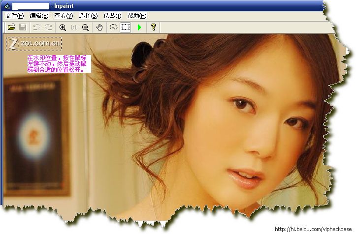 3、 在有水印的位置:按住鼠标左键不动,然后拖动鼠标到合适的位置,松开鼠标即可。