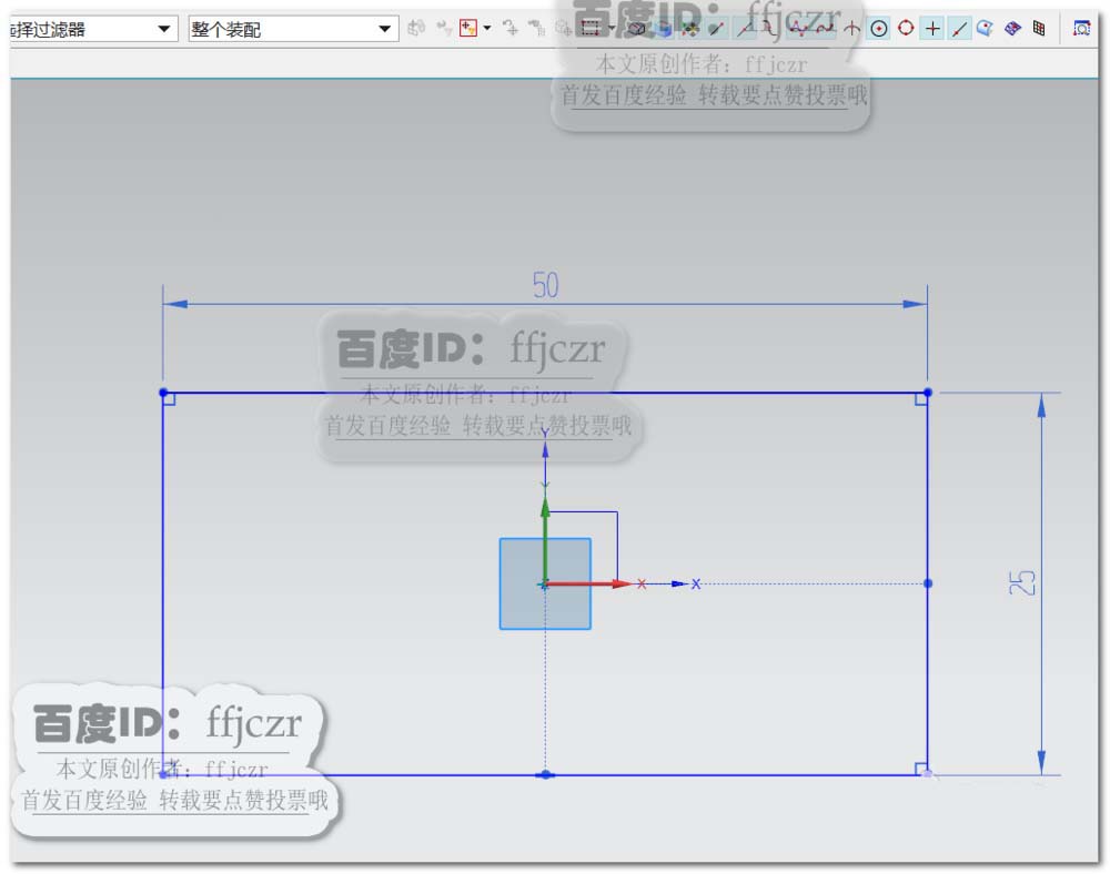 1、用拉伸命令,以XY面为草绘平面,在草绘中,以坐标原点为中心,绘出一个50*25的矩形。如图所示。