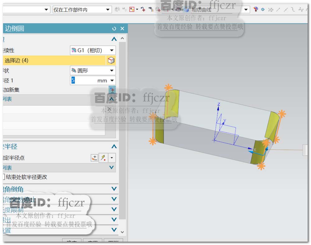 3、选用倒角命令,对拉伸模型的四条竖边进行倒半径为5的圆角;