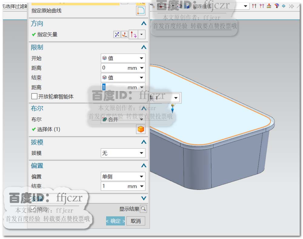 4、选用拉伸命令,截面线为拉伸模型倒圆角后得到的端面轮廓边;指定矢量方向为Z负方向,开始值为0,结束值为1,布尔为合并,选用单侧偏置,值为1.