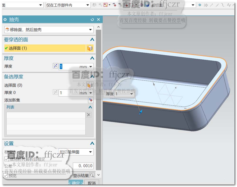 6、选用抽壳命令,移除面为模型的上端面;抽壳厚度为1。
