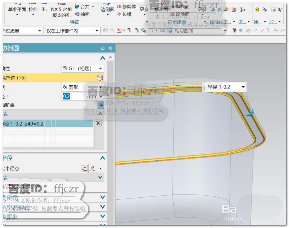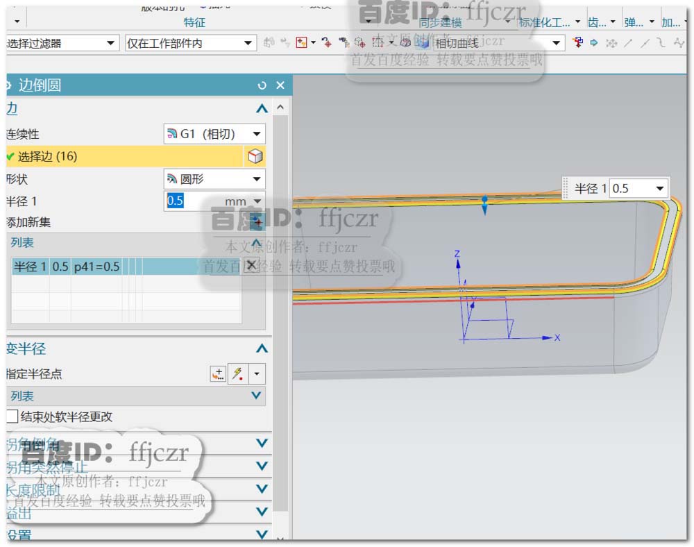 7、对抽壳后模型的边进行倒圆角,如图所示,分别进行二组不同半径的倒圆角,分别为0.5、0.2。