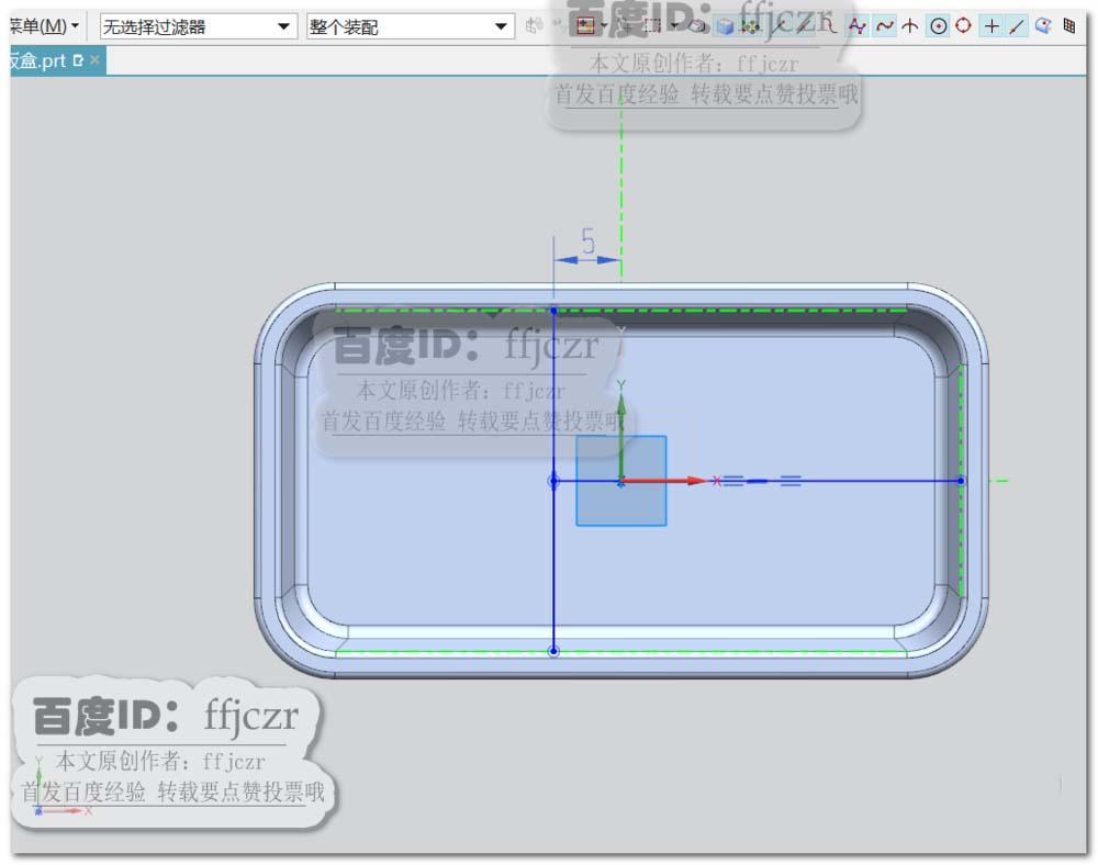8、选用筋板命令,以XY面为草绘平面。在草绘中,绘出筋板的中心线;如图所示,其中一条筋板中心线在X轴上,另一条筋板中心线与X轴垂直且距离Y轴为5。