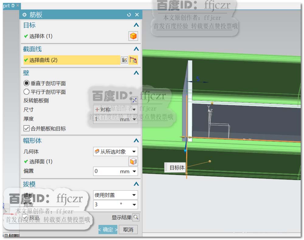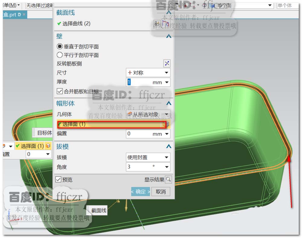 9、回到筋板创建对话框,勾选垂直于剖切平面和合并筋板和目标,筋板尺寸为对称,值为1;帽形体用从所选对象 ,选择的面为盒盖扣位的底面,如图2所示。选用拔模中的使用封盖,角度为3.