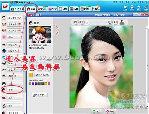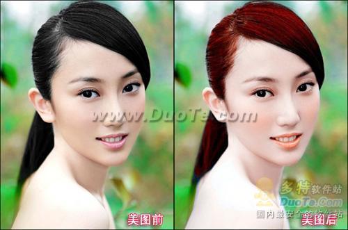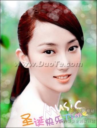 打开一张MM照片,固然黑发也很漂亮,但是为了快乐过圣诞,给头发来点颜色,会让美上加美!直接进入“美容—染发”功能。如图2所示。