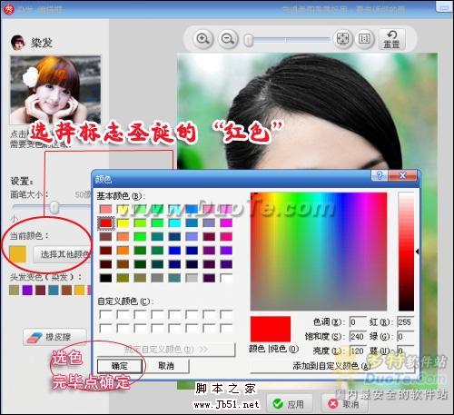 染发编辑框中默认颜色中没有红色。但是我们可以点击“选择其他颜色“,在颜色选择器中选择红色。如图3所示。