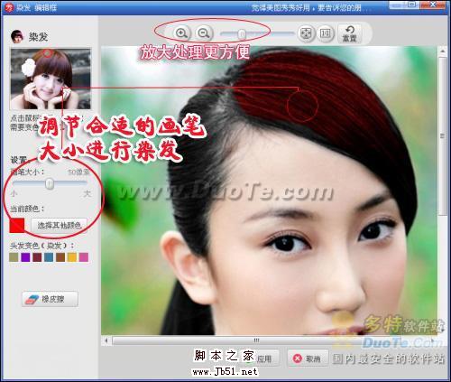 调节画笔颜色,即可对头发进行染色。为了染发效果自然,所以要注意边缘着色。可以选择放大处理。如图4所示。