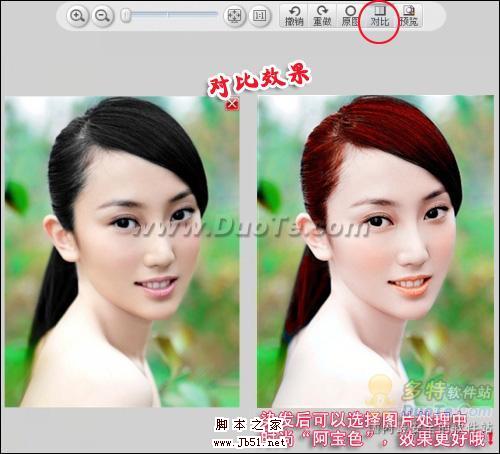 这样就可以瞬间预览自己染发的效果啦。不过“美图秀秀”软件不但可以染发,还有图片效果的一键处理,比如图6中的右侧效果图就加了“图片处理”标签下的“时尚—阿宝色”。