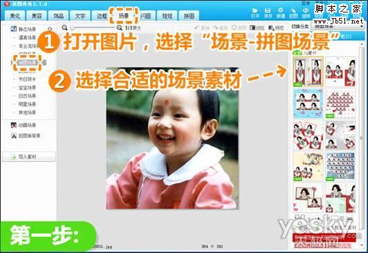1.打开原图后,点击“场景”菜单,选择“拼图场景”。挑选一个合适的素材后点击下载。